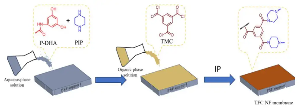 高性能薄膜纳米复合材料(TFN)在高效液相分离方面具有很大的应用潜力。但通过简单的界面聚合(IP)工艺开发具有高渗透性和精确分离性能的膜仍然是一个相当大的挑战。在这项研究中,深圳大学、浙江理工大学的Q. Jason Niu等合成了3,5-二羟基封端的超支化芳香族聚酰胺(P-DHA),并通过界面聚合将其掺入基于哌嗪(PIP)/均苯三甲酰氯(TMC)的纳滤膜的交联PA纳米薄膜中。在水相中添加少量P-DHA,显著提高了所得膜的透水性和盐截留率。亲水性增加、选择层厚度降低、表面电荷增强的协同作用,共同促成了P-DHA-TFC膜优良的透水性、良好的盐截留率和延长的操作稳定性。优化后的PIP-P-DHA/TMC膜,水通量为8.10±1 LMH/bar,约为对照纳滤膜TFC的两倍,该膜还同时保持了超过98%的硫酸钠截留率,长期运行稳定性增强。本研究展现了将P-DHA作为大单体采用IP工艺制备具有优良渗透性和选择性薄层复合纳滤膜的应用潜力。